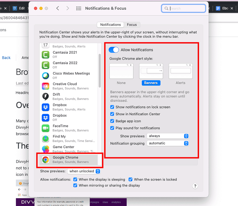 If, after enabling the browser notifications, you still aren't receiving the notifications, check your notification preferences within your operating system (Windows, Apple, etc.). Apple settings shown below.