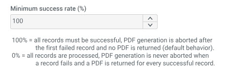 Set the Minimum success rate (%) to 100%. This means all records must successfully process for the PDF to generate. This setting acts as a safeguard until you’re confident everything is working correctly.