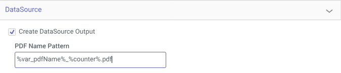 Where it says PDF Name Pattern, enter your desired naming pattern using column headers/variable names into this text %var_[variableName]%. You can even include underscores _ to your naming convention and a counter. For example, %var_pdfName%_%counter%." This format tells CHILI to create a file name like “CampaignA_0001,” “CampaignA_0002,” etc., based on how many rows are in your data source.