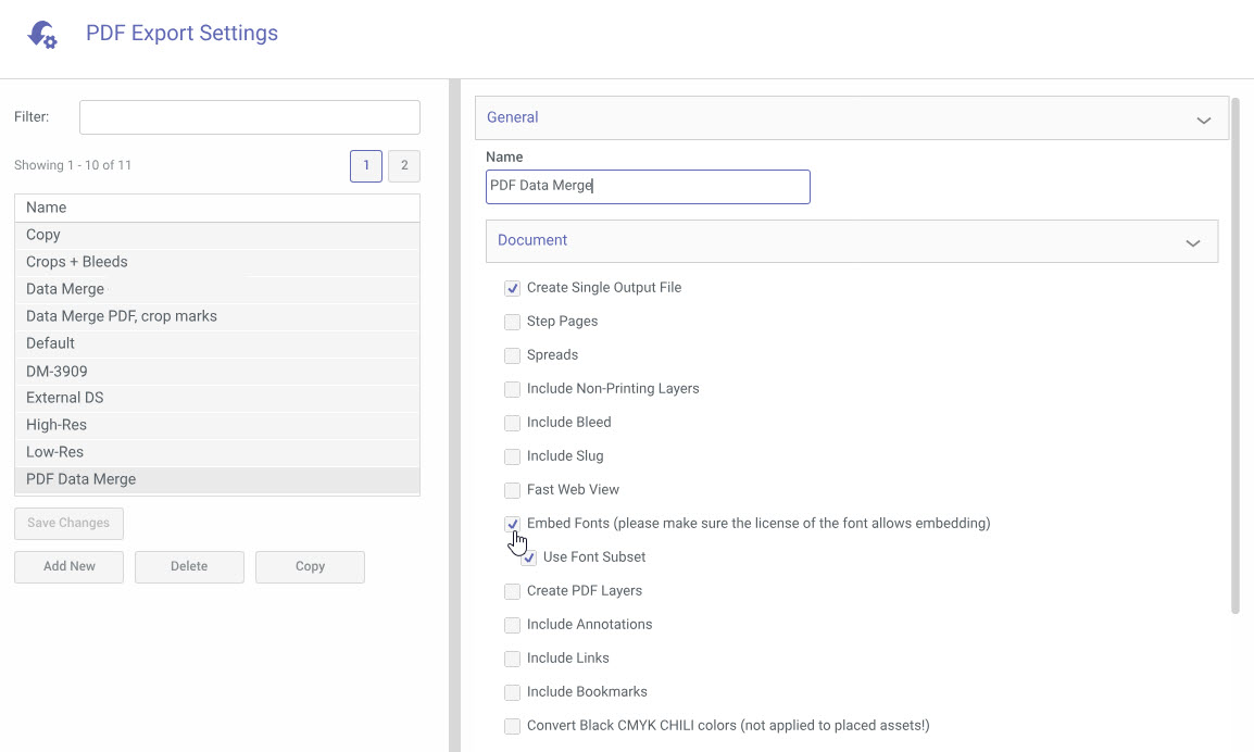 Setting up your PDF export settings, specifically for data merge templates, ensures that your publications are organized and named correctly. This guide will walk you through the steps to create a Data Merge PDF export setting in the CHILI Back Office.