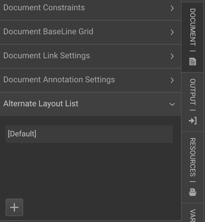 Once you have your base template configured, you’re ready to start adding alternate layouts. To do this, you’ll use the left toolbar to navigate to DOCUMENTS and choose the ALTERNATE LAYOUT LIST panel. You can add new layouts by clicking the + button in the lower left corner of the panel. You can then rename your Alternate Layouts, but keep in mind your end user will not see this list. You will set up the visible names using a list variable once your layouts are finalized.