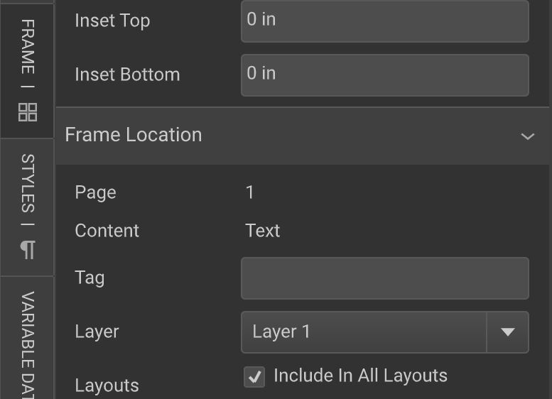- Deleting a frame from one layout will remove it from all layouts. If a frame doesn’t need to appear in a specific layout, go to FRAME > Frame Location and uncheck Include in All Layouts. This allows you to specify which layouts the frame should appear in.