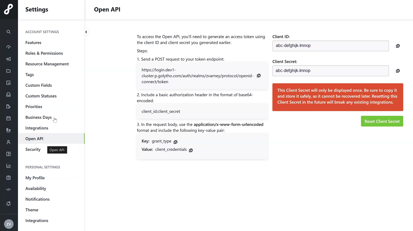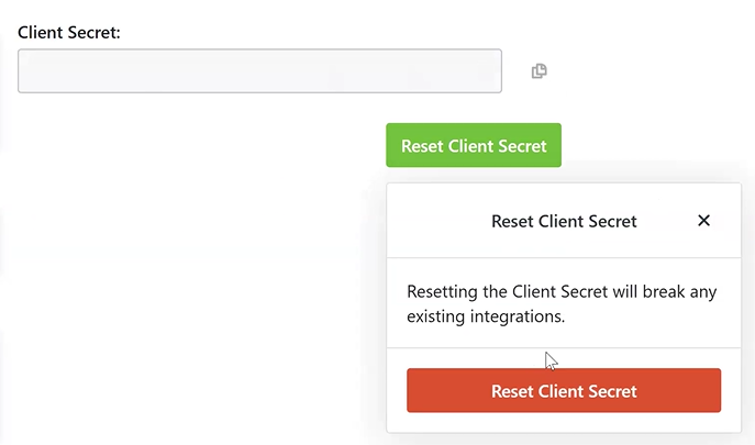 If you misplace your Client Secret, a new one can be generated by selecting Reset Client Secret. Resetting the Client Secret will break any existing integrations that have been established.