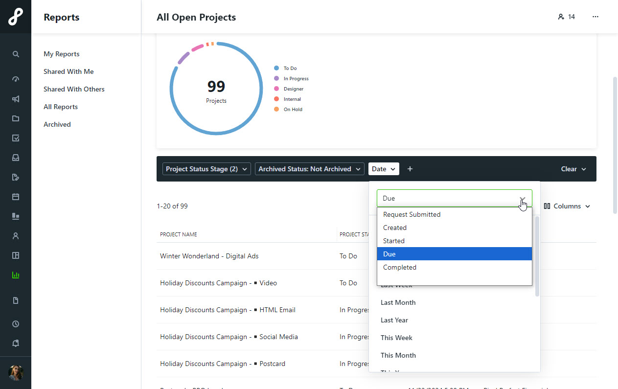 Lytho Workflow’s reporting capabilities enable you to generate detailed, exportable reports to monitor performance, assess workloads, and optimize processes. Reports provide clear data to measure progress and identify areas for improvement.