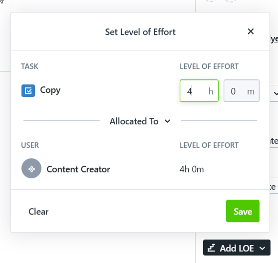 Level of Effort (LOE) helps teams estimate, allocate, and visualize time commitments across Tasks, Proofs, Projects, and Campaigns. This enables smarter planning, balanced workloads, and improved performance tracking.