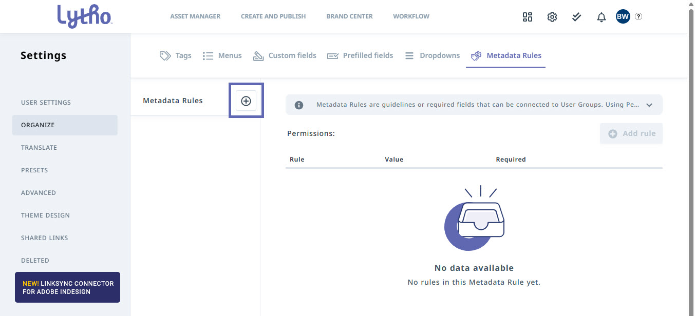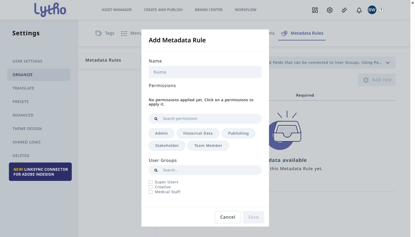 Lytho Pro Tip: Use user-friendly names for your Metadata Rules that align with workflows or departments. For example, “Marketing Campaigns” or “Human Resources.”