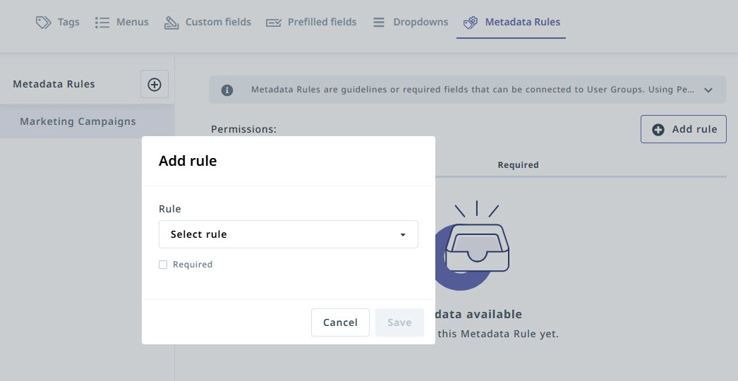 Metadata Rules serve as your built-in content governance framework, ensuring every asset in your DAM is accurate, searchable, and brand-ready. Metadata Rules define the mandatory fields users must complete before uploading files to the DAM helping teams maintain consistency and compliance without slowing down productivity.