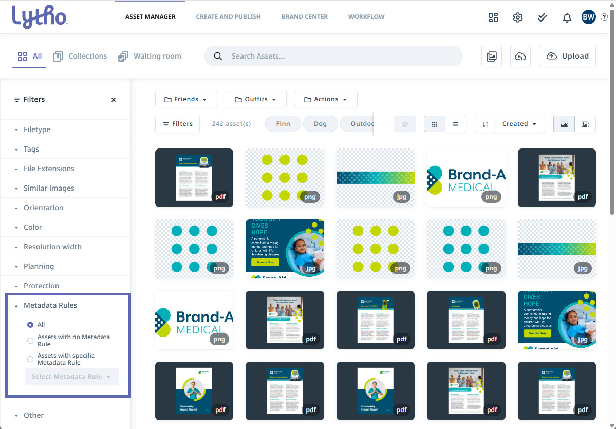 You can filter assets by Metadata Rules in the Asset Manager, making it easier to locate content uploaded under specific compliance guidelines. Filtering options include: