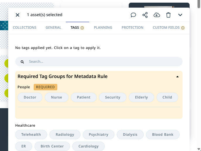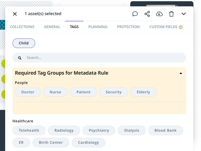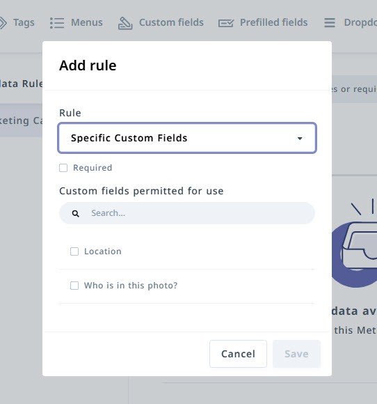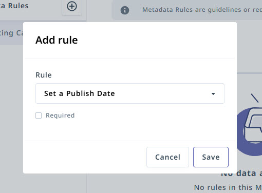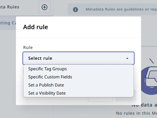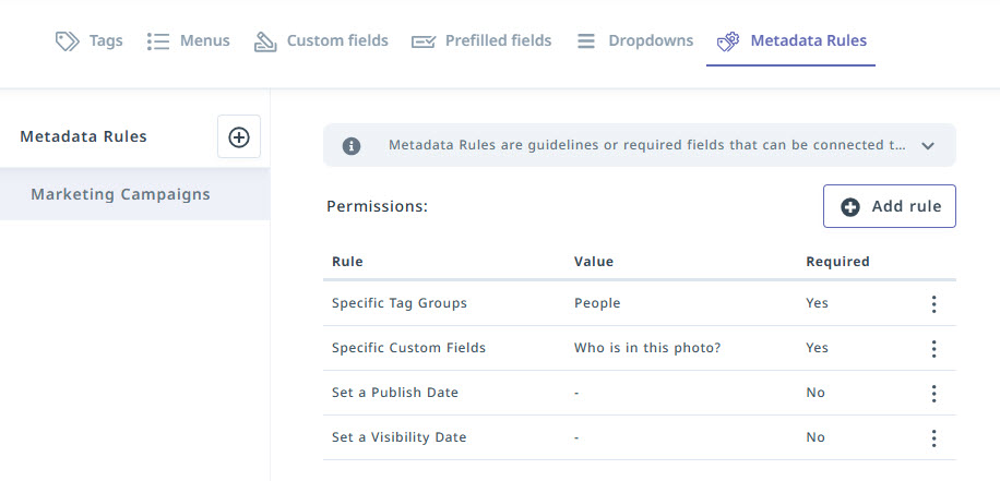 Metadata Rules create structure and enforce compliance by ensuring key metadata fields (Tag Groups, Custom Fields, Publish and Visibility Dates) are applied to assets through their lifecycles. This ensures: