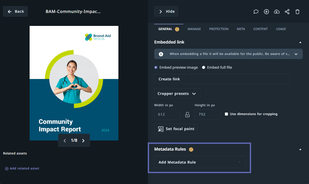 Select the asset, then click All details in the bottom right. Under the GENERAL tab, scroll down to Metadata Rules and use the Add Metadata Rule dropdown to apply your rule. Then, complete any required fields (Tag Groups, Custom Fields, Publish and Visibility Dates).