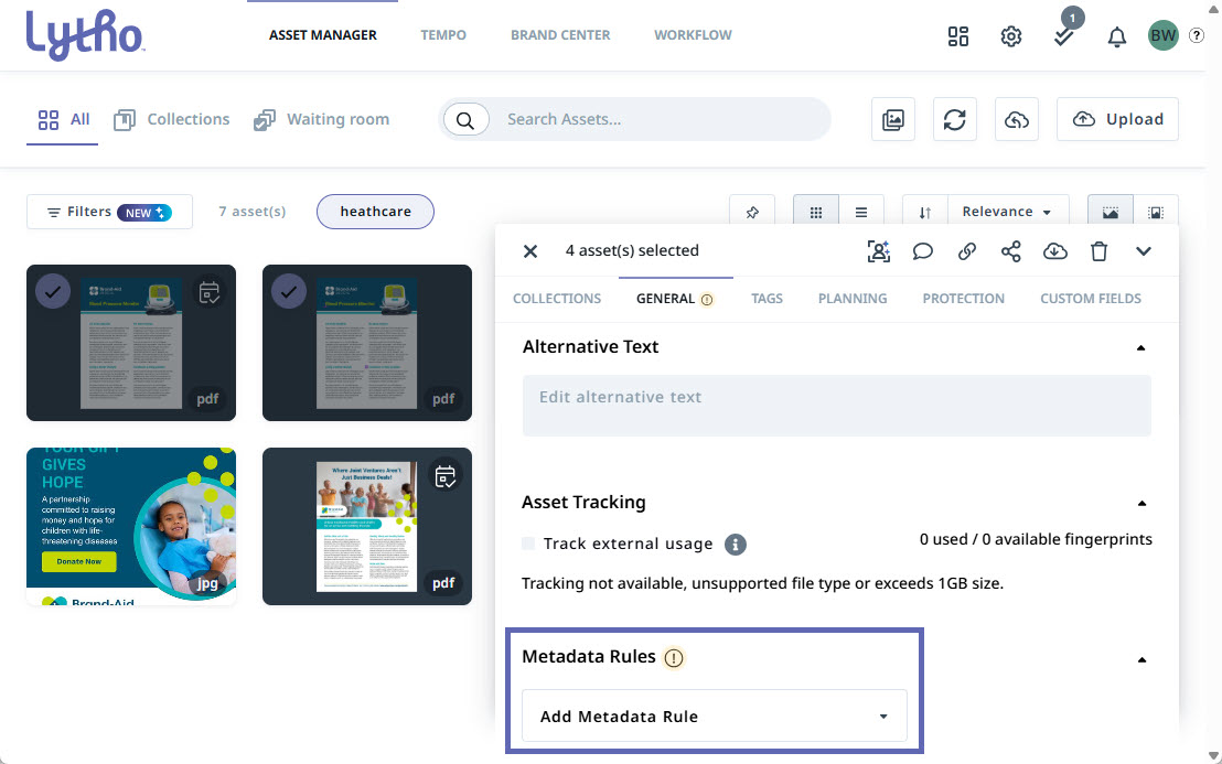 Lytho Pro Tip: Assets in the same Metadata Rule group allow for bulk field applications. If assets have different Metadata Rules, you must apply fields individually.